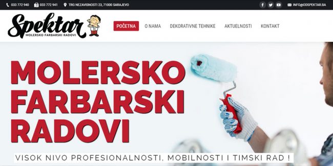 Dobrodošli na našu novu web stranicu na kojoj ćemo predstaviti kompaniju “Spektar” Sarajevo i molersko farbarske usluge koje nudimo. Budite i vi naš zadovoljni klijent koji nam  je povjerio povjerenje.